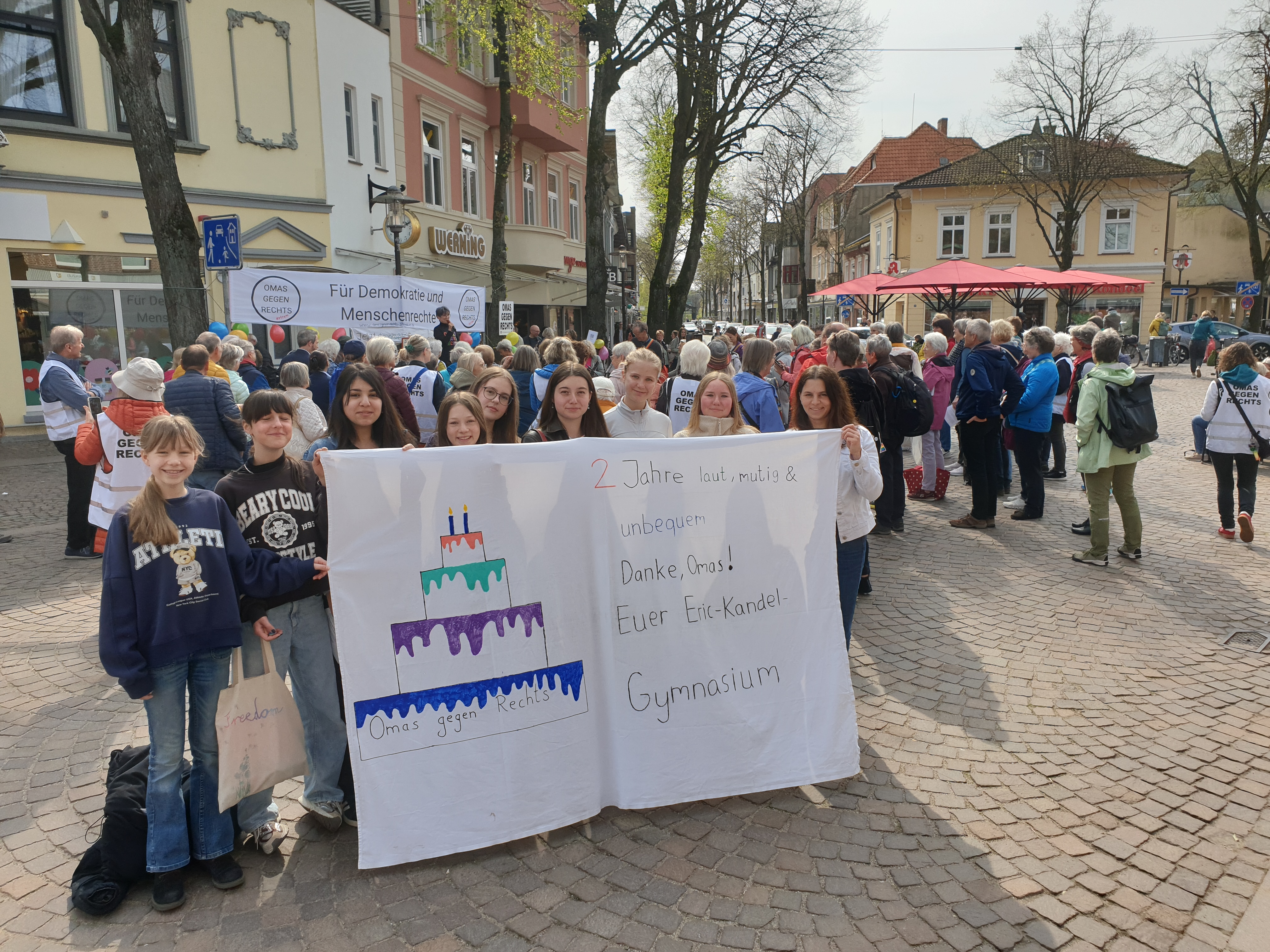 Am letzten Samstag (18.4.2026), waren die „Omas gegen Rechts“ auf dem Rondeel in Ahrensburg und wir, die Courage AG des EKGs, gratulieren im Namen des ganzen EKGs herzlich zum 2-jährigen Bestehen! Bei traumhaftem Wetter und bester Stimmung wurde gemeinsam gefeiert, gelacht und ein starkes Zeichen gesetzt.