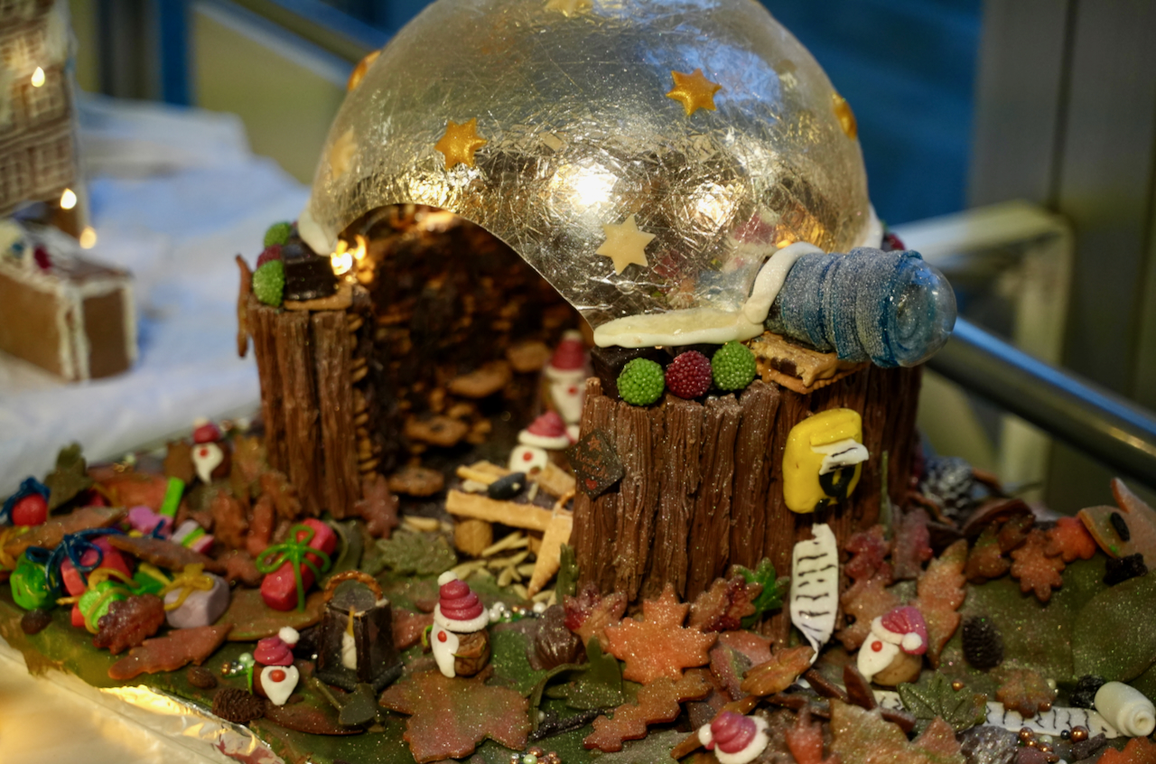 Das Bild zeigt das Knusperhäusschen, das den Wettbewerb gewonnen hat. Es hat eine Kuppel aus Zuckerguss. An der Wand hängt ein Briefkasten. Mehrere kleine Weihnachtswichtel tummeln sich im herbstlichen Garten zwischen kleinen Geschenkpaketen.