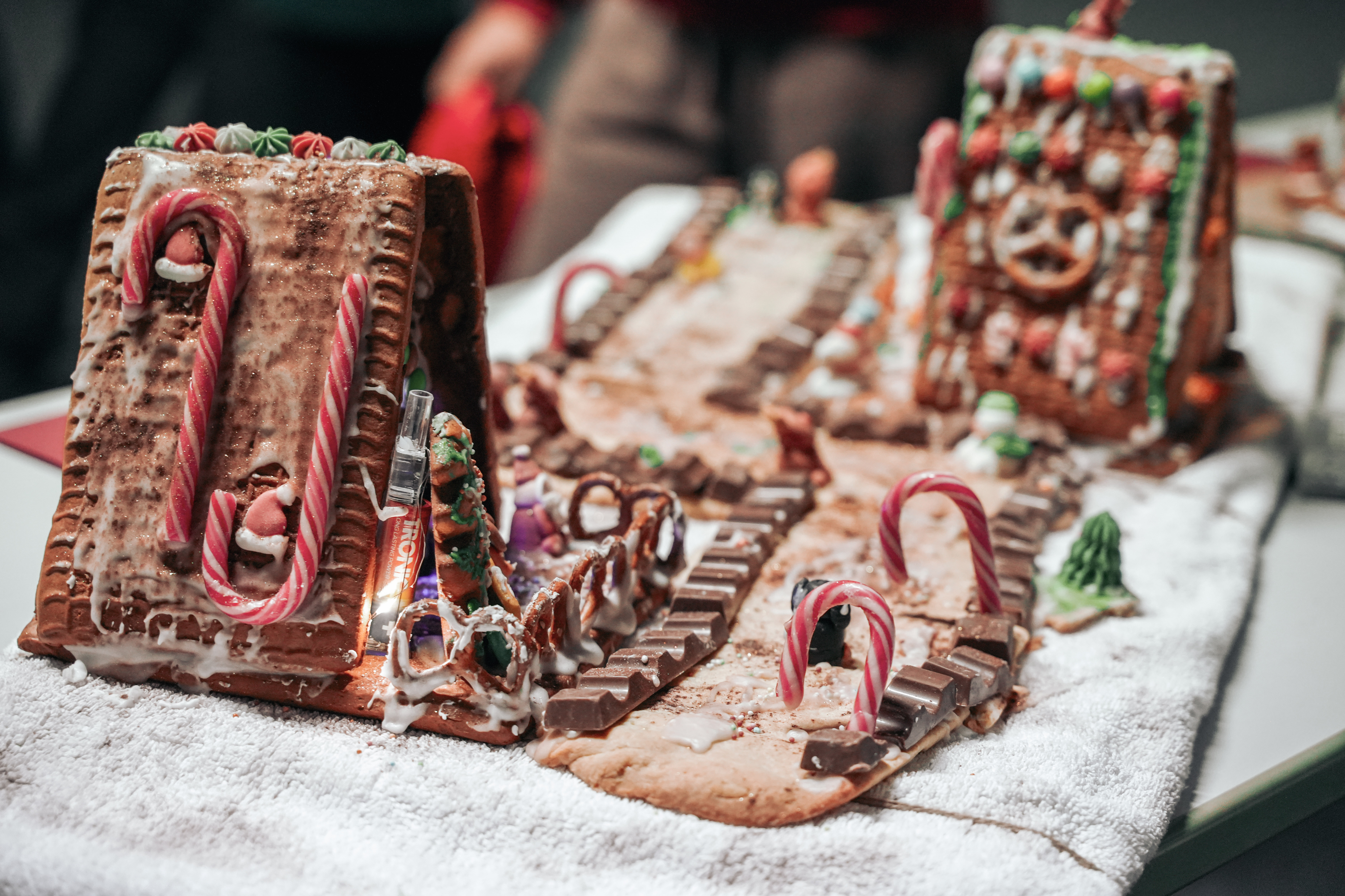Das Bild zeigt weitere Knusperhäuschen, die mit Zuckerstangen, Kinderriegeln und kleinen Salzbrezeln dekoriert sind.